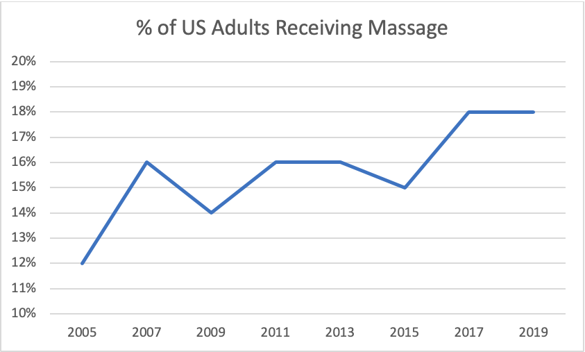 A natural follow-up question: If the number of massage therapists is relatively flat, what about demand for massage? ABMP’s biennial consumer research survey into massage consumer behavior suggests that 18 percent of adults in the US received a massage in 2018. Compared to 12 percent in the 2005 survey, and a median of 15 percent from 2007 to 2015, it seems safe to deduce that demand for massage therapy has increased over the past decade. Our research partners at Harstad Strategic Research would tell us that looking at that trendline, and given the sample sizes used to collect the data, in essence massage usage has grown since 2005, but more slightly when looking at the past five editions of the survey (a range of 16–18 percent).