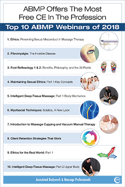 2018 was another wonderful year for continuing education at ABMP, and we’re telling you about the top 10 webinars of the year. New video-based courses were added to the library covering a wide range of topics, including myofascial techniques, techniques for specific conditions, pathology, marketing, ethics, ayurveda, ashiatsu, and more.