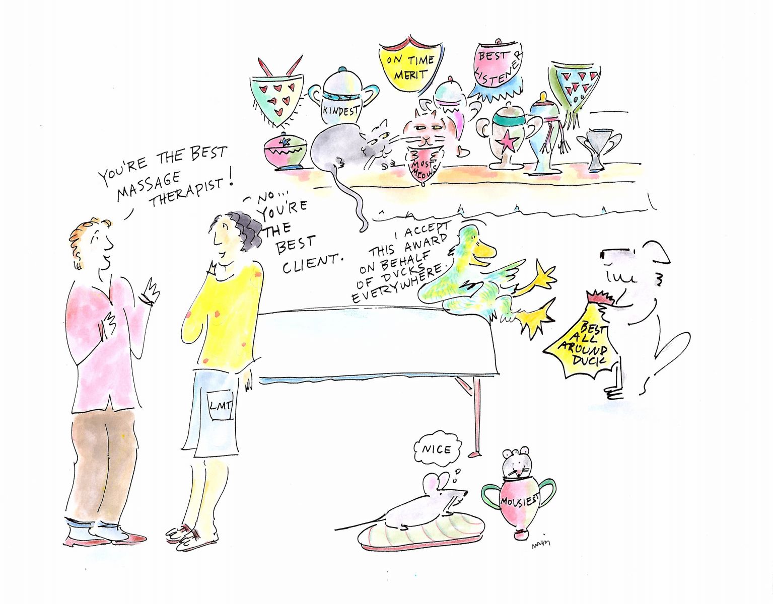 Today I have the honor of raising my glass to toast Mari Gayatri Stein, a gifted illustrator who spent years drawing mirthful, insightful images educating others about ethics in the massage therapy field. Mari passed away last week on March 2 after a journey with cancer; today would have been her 70th birthday.