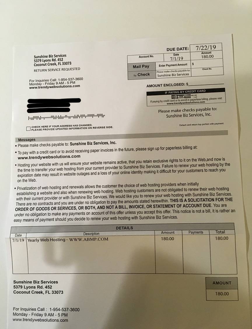 ABMP members have recently shared more instances of receiving unsolicited "offers" from various web hosting companies that appear as invoices and imply that members need to pay a certain dollar amount to maintain their website listing as outlined in the news story at www.abmp.com/updates/news/web-hosting-scam-targets-massage-therapists. This confusing “offer” is simply a ploy targeting website domains including www.massagetherapy.com. These web hosting companies include Sunshine Biz Services and Domain Listings.